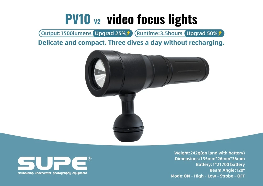 Supe PV10v2 video light equipment is designed for professionals. Observation, video or photography, the lamps from SUPE are suitable for all these activities and are waterproof to a depth of 100 m.